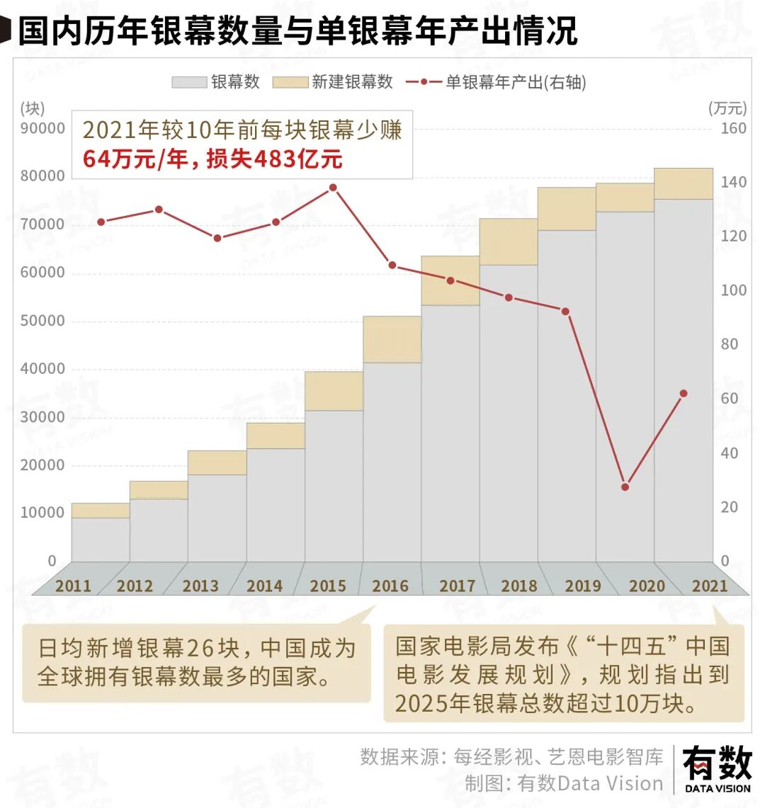 2016年是中国电影业的一个巅峰时刻:平均每天新增26块银幕,成为全球拥有银幕数量最多的国家。哪怕在2021年,仍有日均新增近18块的高速增长。
