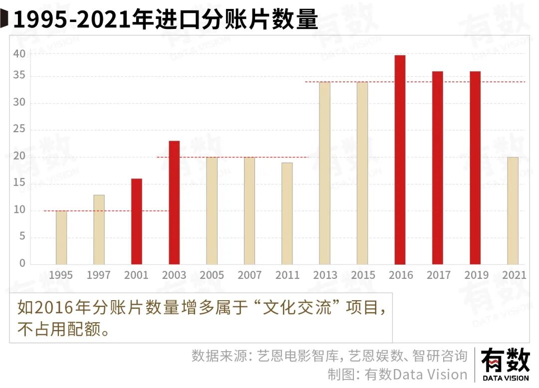 2021年,分账片配额数量依旧为34个名额。但实际上映的仅有20部。