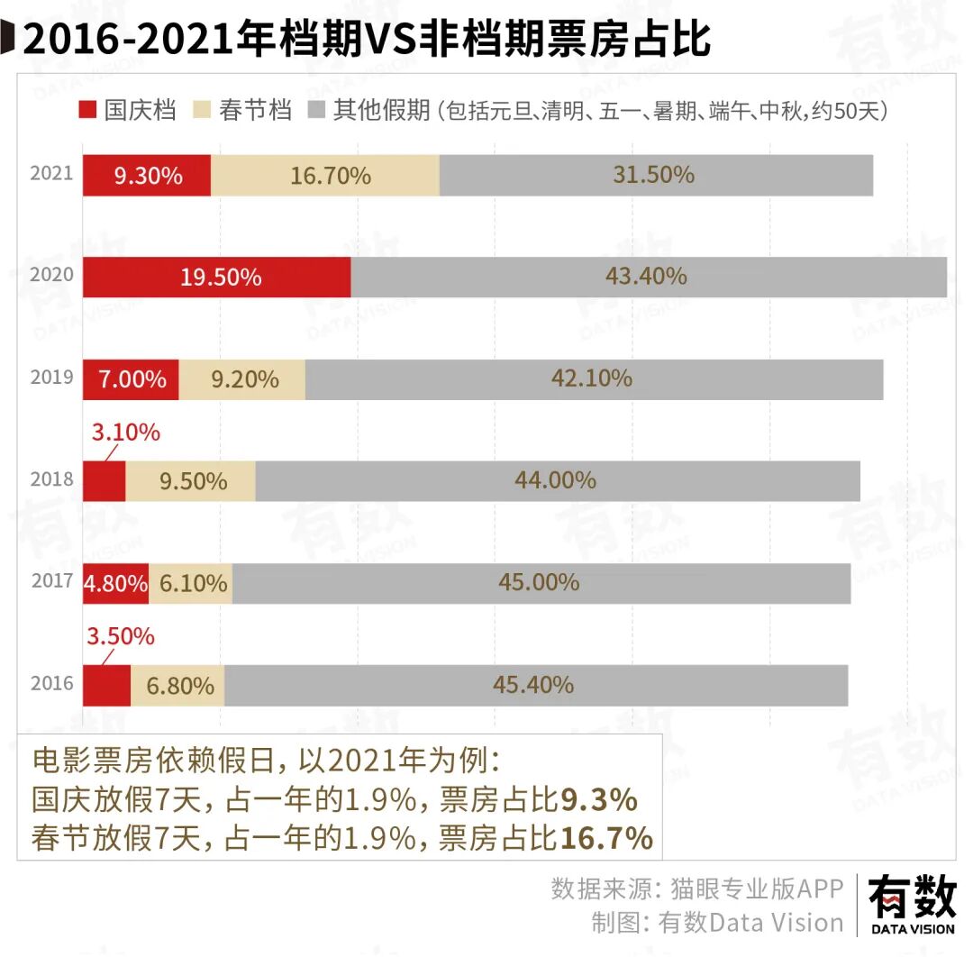 2020年固然有疫情因素,但一般来说,国庆档+春节档共计14天的时间,票房占比往往能达到10-25%以上。