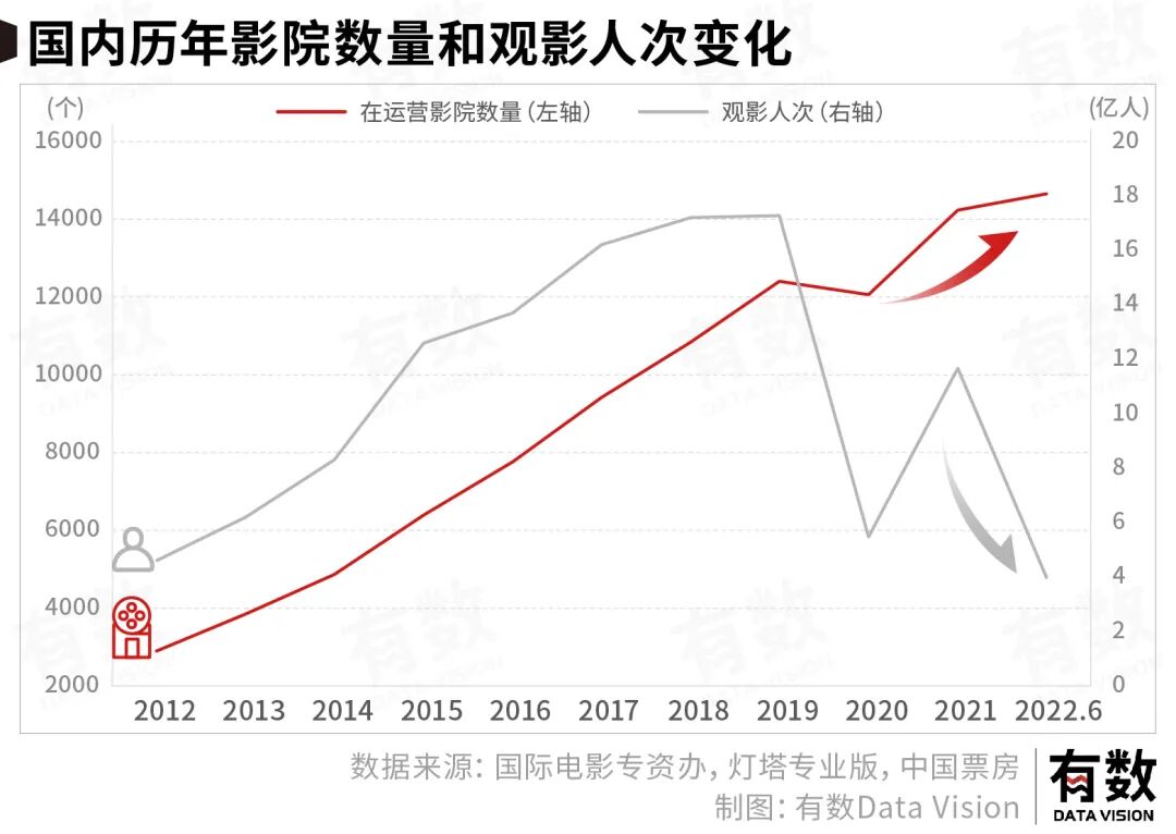 三年间,国内电影院新增超过2000家。但观影人次却由2019年的17.3亿人次一路下滑至4亿人次。正如中国电影基金会的朱玉卿所说:“1万家影院日票房低于300元,连水电费都不够。”