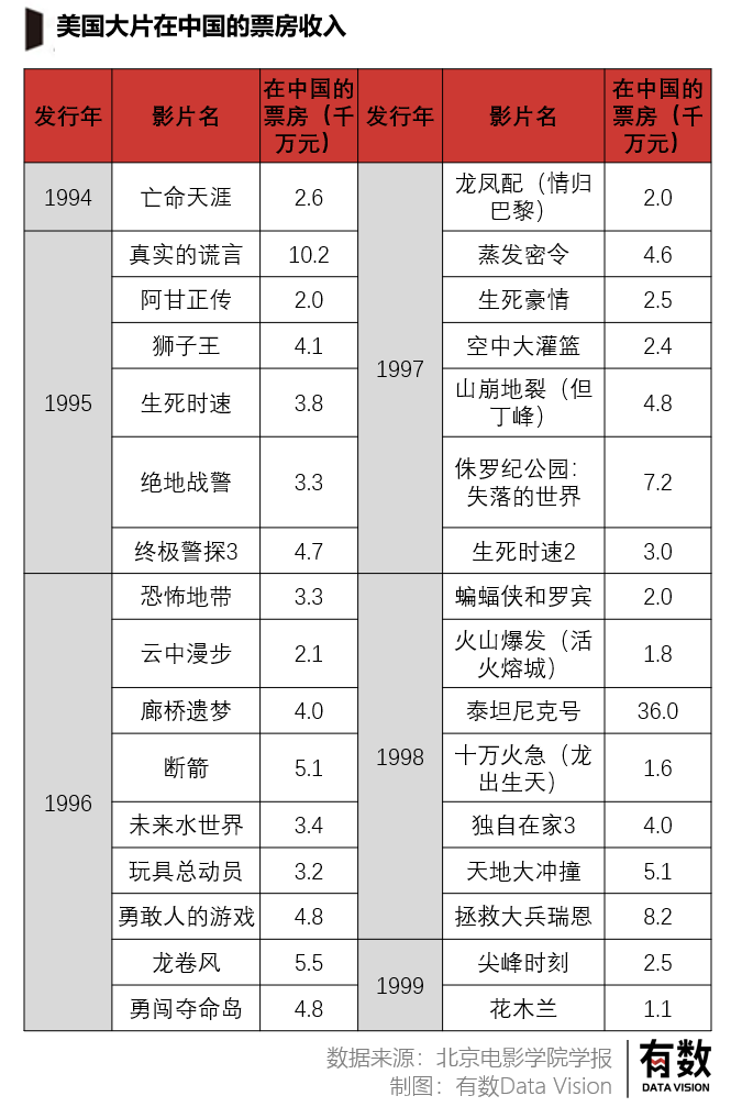 比如《泰坦尼克号》创造了4400万美元收入,但扣掉税金、关税和其他费用后,发行方20世纪福克斯的收入只有不到1000万美元。另外,好莱坞发现很多中国家庭会直接购买DVD和盗版光盘,看《教父》这类当时未被引进的影片。