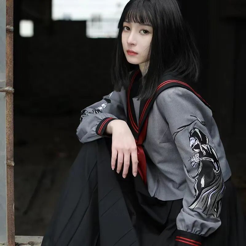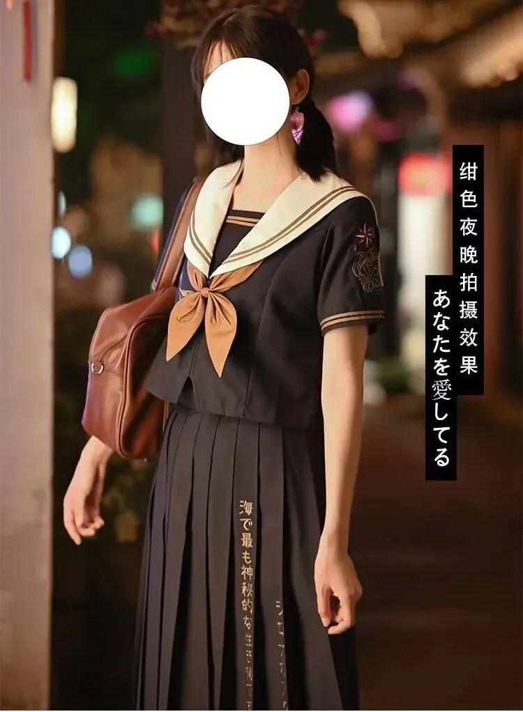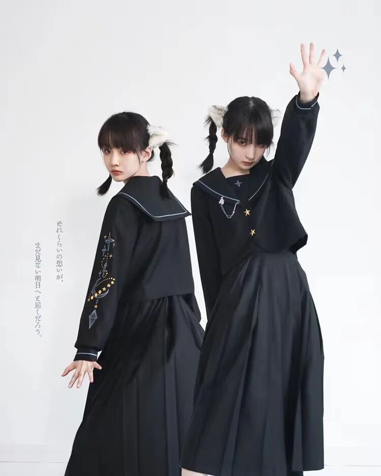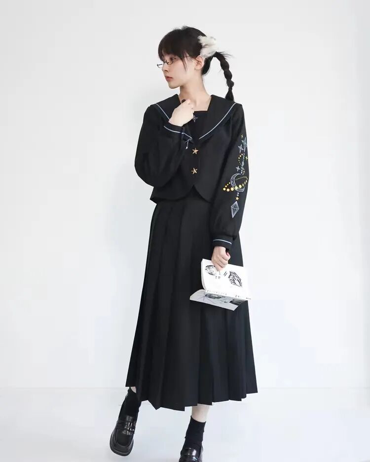 这类裙子的裙长普遍在50cm以上,水手服的话通常会有一些彰显个性的刺绣。
