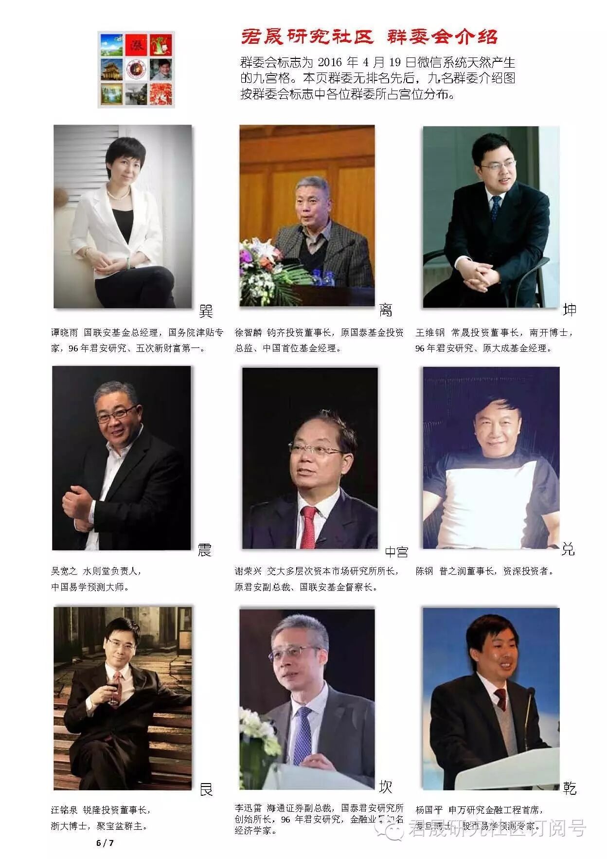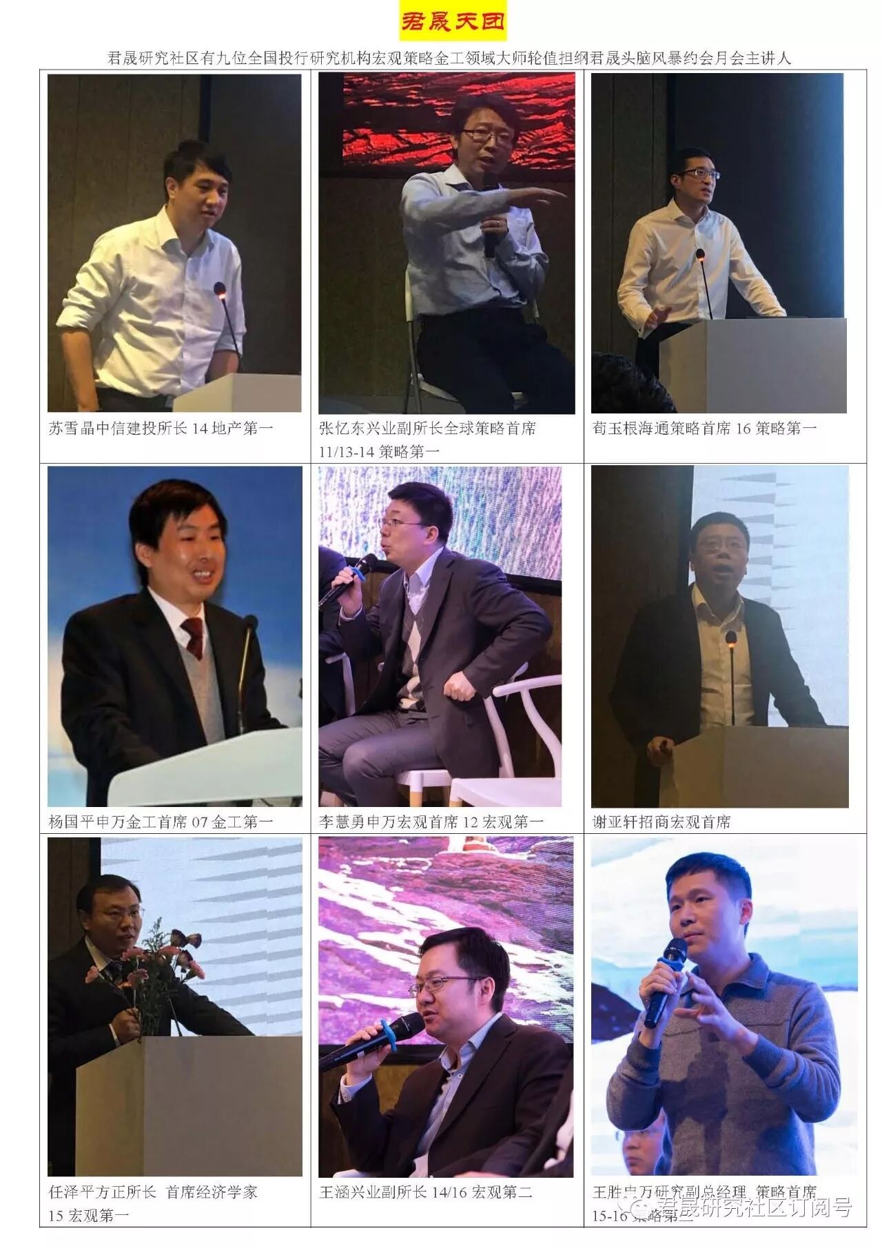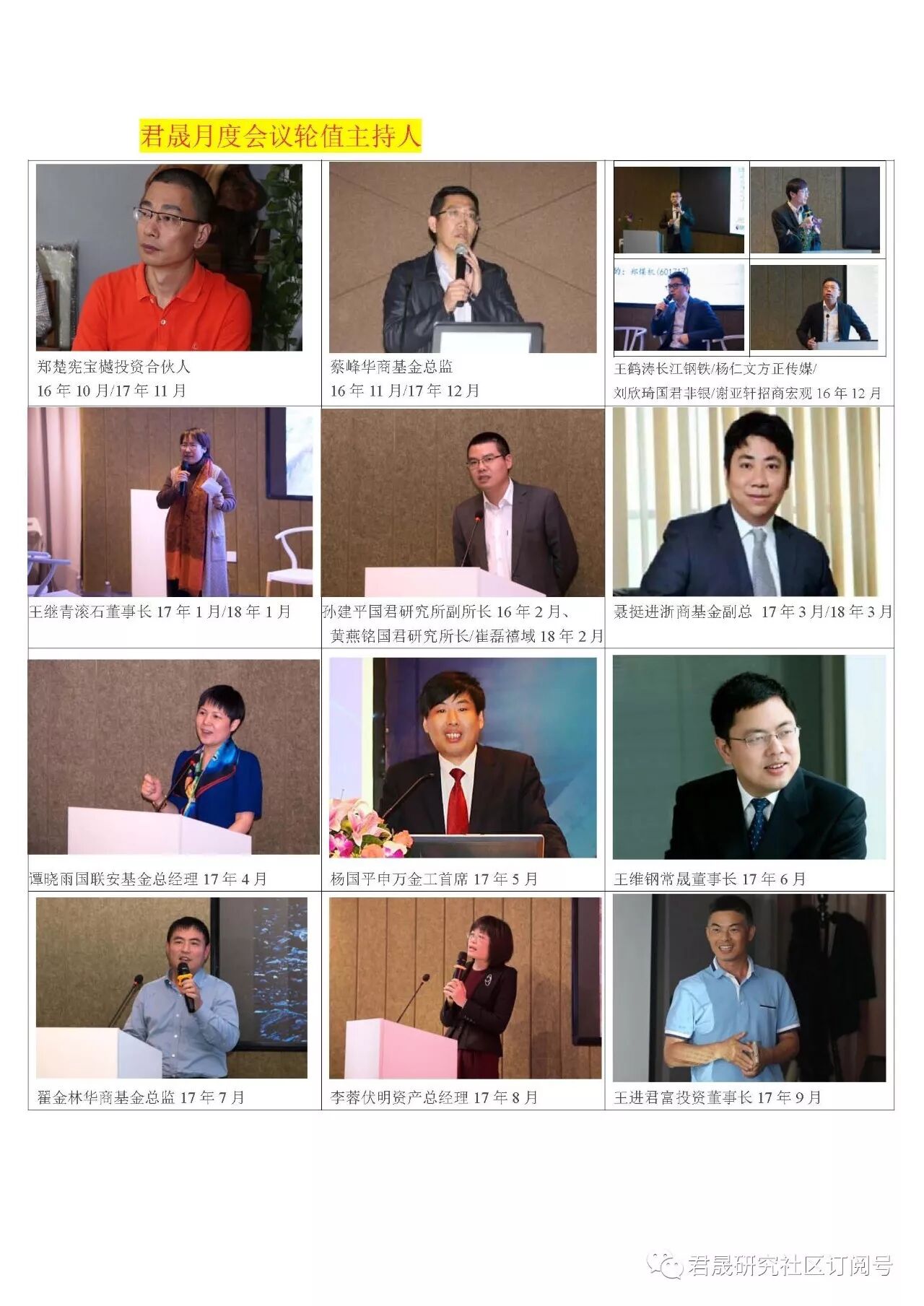 郑楚宪宝樾投资合伙人16年10月/17年11月、蔡峰华商基金总监16年11月/17年12月、王鹤涛长江钢铁/杨仁文方正传媒/刘欣琦国君非银/谢亚轩招商宏观16年12月、王继青滚石董事长17年1月/18年1月、孙建平国君研究所副所长16年2月、聂挺进浙商基金副总17年3月/18年3月、谭晓雨国联安基金总经理17年4月、杨国平申万金工首席17年5月、王维钢常晟董事长17年6月、翟金林华商基金总监17年7月、李蓉伏明资产总经理17年8月、王进君富投资董事长17年9月、黄燕铭国君所长/崔磊禧域18年2月。以上至少十二位资深专业人士每年轮值一次担任君晟月度会议君晟主持人。