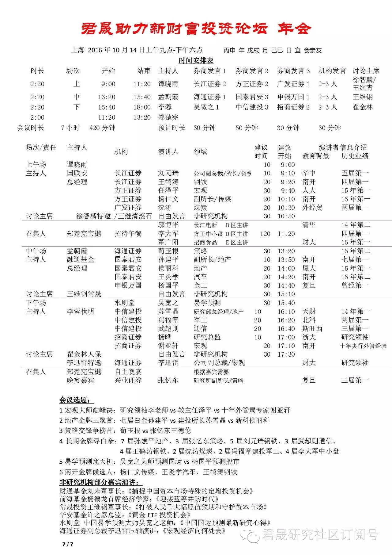 7、16年10月14日君晟研究社区组织君晟年会《君晟助力新财富投资论坛》,君晟邀请全国机构投资者负责人及投研总监和九家主流券商的公司领导或研究所负责人共11人及19位金牌首席和全部君晟群委李迅雷老师、吴宽之老师、谢荣兴、谭晓雨、王维钢、杨国平、徐智麟、陈钢(出国缺席)、汪铭泉及全部君晟轮值主持人合计70位专业人士参加。详见《致谢公开信!君晟研究社区成功主办君晟助力新财富投资论坛的致谢公开信20161015》、《精彩回放!君晟助力新财富投资论坛现场实况精彩回放20161016》。本次君晟年会《君晟助力新财富投资论坛》组织方包括五位发起人谭晓雨、翟金林、王维钢、王继青、李蓉及会务总协调人郑楚宪、分区召集人蔡峰、王进等八位君晟主持。年会成果包括五篇君晟年会特辑:《君晟年会特辑一 守土有责,防守反击!王维钢:打破人民币大幅贬值预期和守护资本市场是确保中国经济安全的首要任务20161014》、《宏观巅峰对决:君晟年会特辑二 人民币汇率必须或可能大幅贬值吗?-专家观点纪要20161014》、《地产金牌三聚首:君晟年会特辑三 七届白金孙建平vs建投所长苏雪晶/19陈慎首席vs 新科8侯丽科首席》、《策略交锋争榜首:君晟年会特辑四 13荀玉根海通团队vs22王德伦/张忆东兴业团队vs18王胜申万团队vs29周金涛/王君建投团队》、《君晟年会特辑五 金融工程12号申万杨国平博士:量化和主动融合是证券投资的核心竞争力__兼谈金融工程研究的三大新趋势》。
