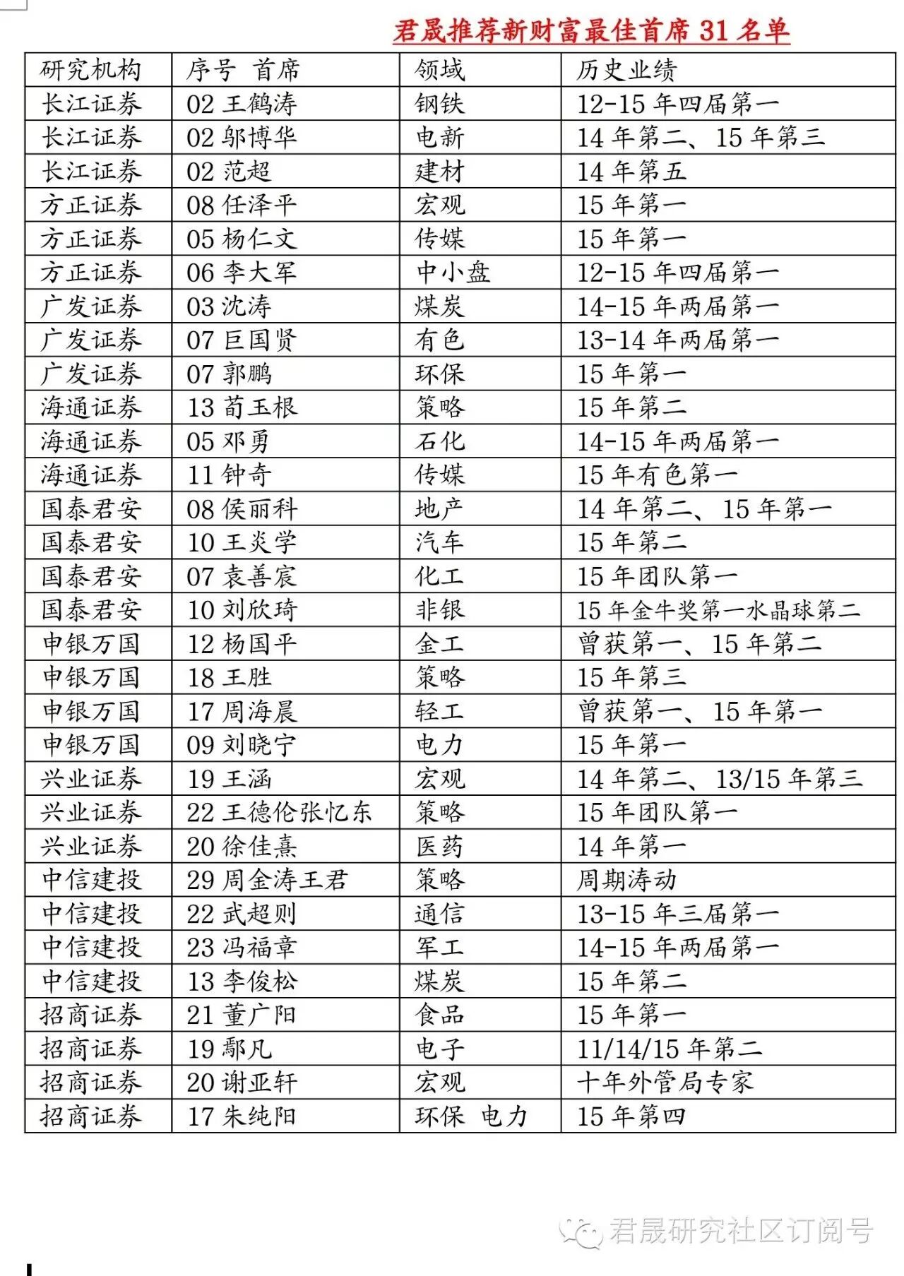 4、16年10月10-18日,经征求九大研究机构负责人和部分君晟群委与投研总监意见,君晟研究社区16年10月10日推出《君晟推荐新财富最佳首席名单20161010》,连续七次推荐全国九大投行研究所的31位金牌首席,10月18日发布《终极第7弹!君晟推荐新财富最佳首席名单20161018》。在《第14届新财富最佳分析师名单20161125》中,君晟研究社区有71位首席获奖,在33个行业或领域中有26个第一,19个第二,15个第三,8个第四,3个第五。10月14日君晟推荐的31位首席中29位获奖,有14个第一,5个第二,6个第三,2个第四,2个第五。王博士私人推荐四位获1个第一,2个第三,1个第四。