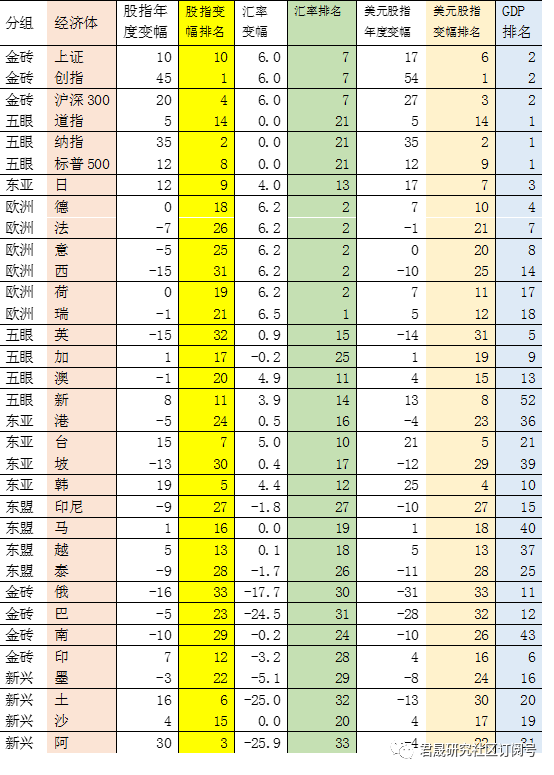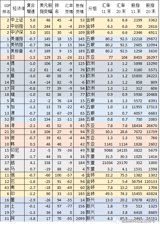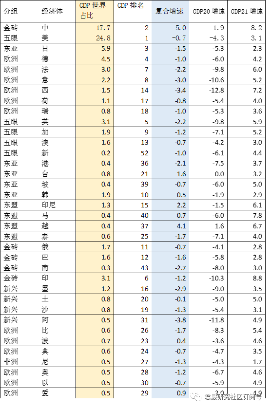 以下对包括中美在内29个全球前20大及东亚重要经济体的33个股指ETF作为资产标的做出资产收益率排名,对29个重要经济体的GDP占比和2020-2021年GDP复合增速做出排名。