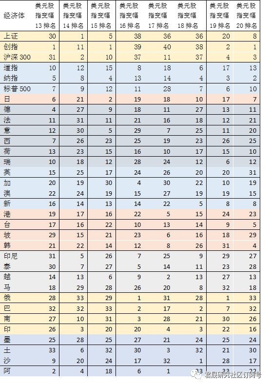 表6:主要经济体2012-2020年美元计价股指变幅排名表