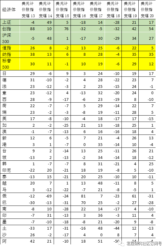 表4:29个重要经济体33个美元计价股指2012-2020年年度变幅一览表