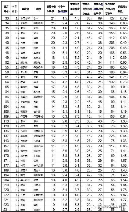 2019年初:1加拉加斯143、2香港 49、3北京45、4上海45、5深圳42、11广州29、6孟买39、8台北32、19新加坡22、21伦敦21、71东京13、29巴黎19、100纽约12、22首尔21、160旧金山9、158苏黎世9、大阪、190洛杉矶8、47慕尼黑16、134柏林11。
