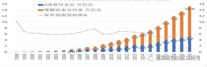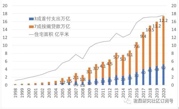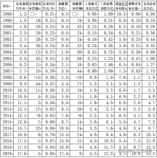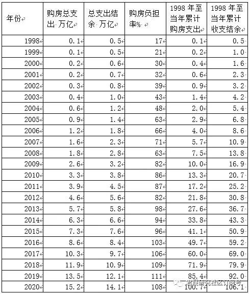 三、1998年是中国房改元年。1998-2020年全国合计商品房住宅销售面积 207万平米、住宅加权均价0.64 万元/平、住宅销售额132 万亿,按3成测算首付支出40万亿、按7成测算按揭贷款93万亿,君晟测算结论是:等额还本和付息61万亿、居民住宅总支出101万亿,2020年末累计未偿还本息合计126万亿、累计已还和未还本息合计187万亿。2020年测算购房总支出15.2万亿已经超过城镇居民年度收支结余测算结果14.1万亿。