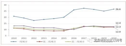 2020年50城房价收入比均值为13.4,相比2019年的13.2上升了1.4%。历史走势来看,2010-2015年间房价收入比持续回落,2016年房价收入比开始快速回升至11.9,同比增速达15%,2017年继续升至13.7、同比增速略有收窄,2018年50城房价收入比与2017年持平,2019年50城房价涨幅收窄、房价收入比小幅下降,2020年受疫情影响居民收入增速相比前几年出现较大幅度下滑、房价收入比上升。一线城市的房价收入比水平明显高于其他城市,2020年一线城市房价涨幅最大、房价收入比在连续两年下降后再次上升。强二线城市、弱二线城市与三四线城市的房价收入比较为接近,2020年房价收入比分别为12、12.3和12.4。