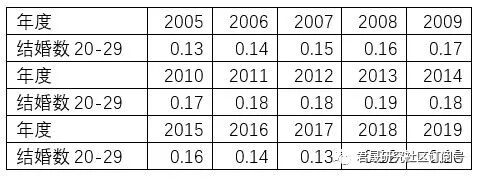 自2005年国家统计局有分项数据以来,中国20-29岁结婚数从1300万逐渐上升到2013年峰值1900万后,逐年递减到2019年的1000万。