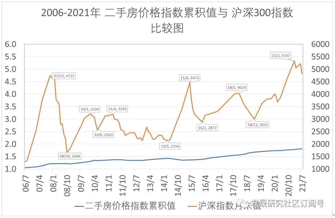 2006-2021年 二手房价格指数累积值与 沪深300指数比较图