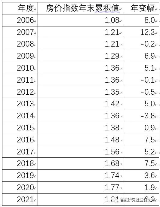 以2005年末为基期的2006-2021年二手房房价指数年末累积值与年变幅一览表