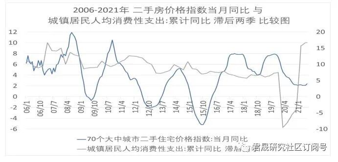 2006年-2021年城镇居民人均消费支出滞后两季累计同比与70城二手住宅价格指数当月同比的因果分析图
