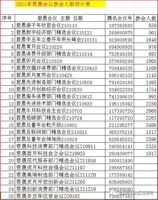 君晟总量年度会议乾天场210801周日,詹粤萍民生通惠资管副总、李蓉伏明资产,赵晓光天风副总裁 电子10-16第一铂金@上海、郭磊广发宏观17-20第一@上海、刘富兵国盛金工14-17/19-20一@上海,第一阶段腾讯会议号:231 295 277,荀玉根-海通副所长策略16-20第一@上海,公募机构领导讨论环节(许之彦华安基金助总、艾小军国泰基金总监、华夏基金等)参会人数3598人。