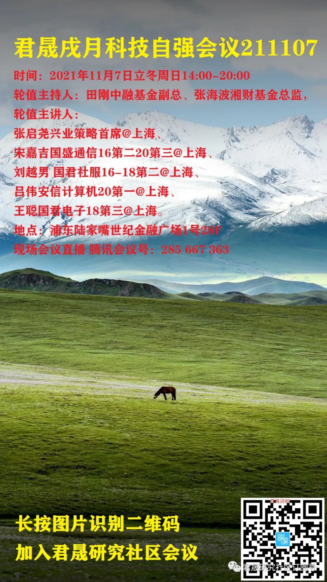 君晟戌月科技自强会议211107周日立冬,285 667 363 田刚中融基金副总、张海波湘财基金总监,张启尧兴业策略、宋嘉吉国盛通信、刘越男国君社服、吕伟安信计算机、王聪国君电子。