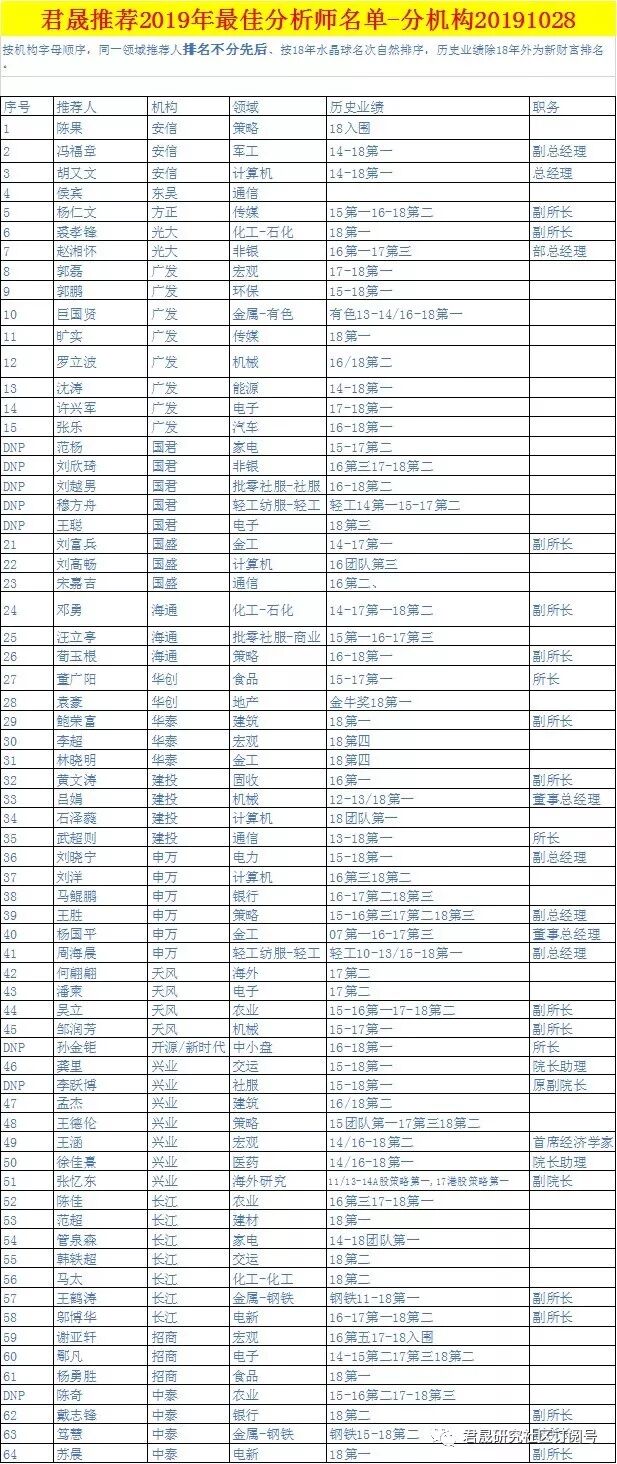 5同业公益-君晟推荐2019年最佳分析师名单-2019年8月30日~11月22日