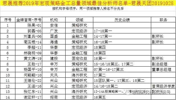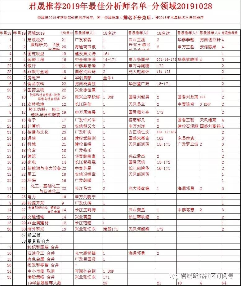 4、2018年9月12~21日,君晟研究社区推出《君晟推荐2018年最佳分析师名单20180912》征求意见稿,经征求君晟研究社区投资机构投研总监和全部研究机构负责人/君晟群委/主持人意见,9月21日在汇总各研究机构负责人增补修订意见并校正历史业绩数据后发布《君晟推荐2018年最佳分析师名单终极版20180921》,请各位全国机构投资者投研总监基金经理多多支持33个行业或总量领域的48位金牌首席。