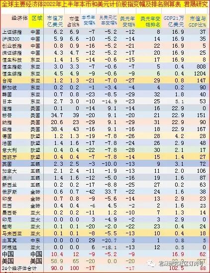 在全球24个主要经济体的32个主要股指2022年上半年表现中,