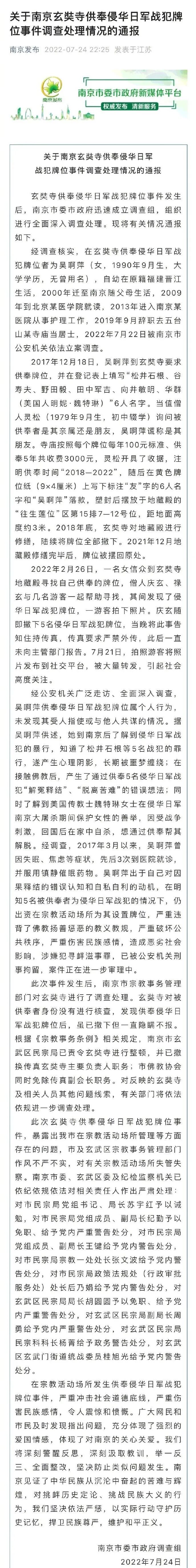 7月24日,南京市委市政府调查组发布《关于南京玄奘寺供奉侵华日军战犯牌位事件调查处理情况的通报》,通报全文如下: