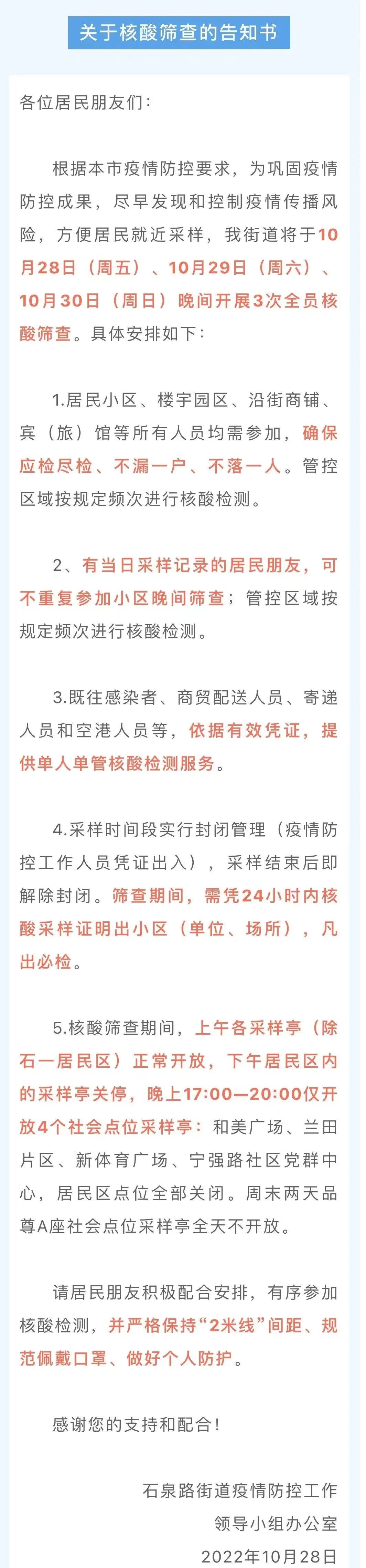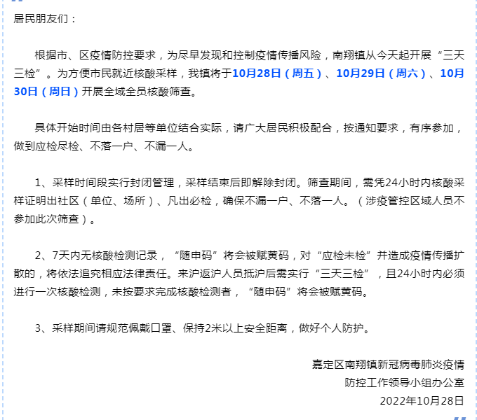 29日,“半淞园路街道”公众号发布告居民书:10月29日(周六)开展全员核酸筛查,晚上18:30—20:30提供社区核酸采样。原定10月30日(周日)全员核酸筛查暂停。