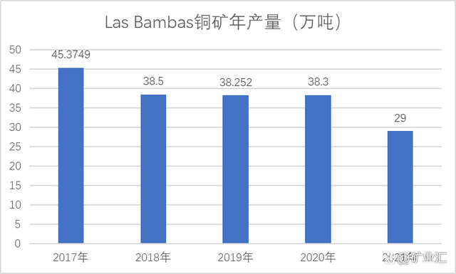 2016年,拉斯邦巴斯(Las Bambas)铜矿开始商业化生产,2017年产铜达到45.3749万吨,但随后的三个年度,受品位下降和社区堵路等问题干扰,基本维持在38.3万吨的铜产量,2021年,社区问题突出,Las Bambas的铜产量仅为29.0097吨。
