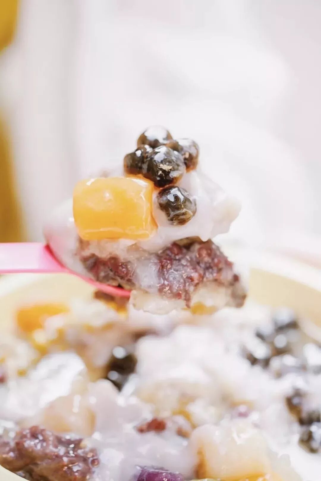 清补凉也是这里的主打王牌,先用榨好的椰汁打底,有黑凉粉、芋圆、西米...十多种料,都快要满到溢出了!