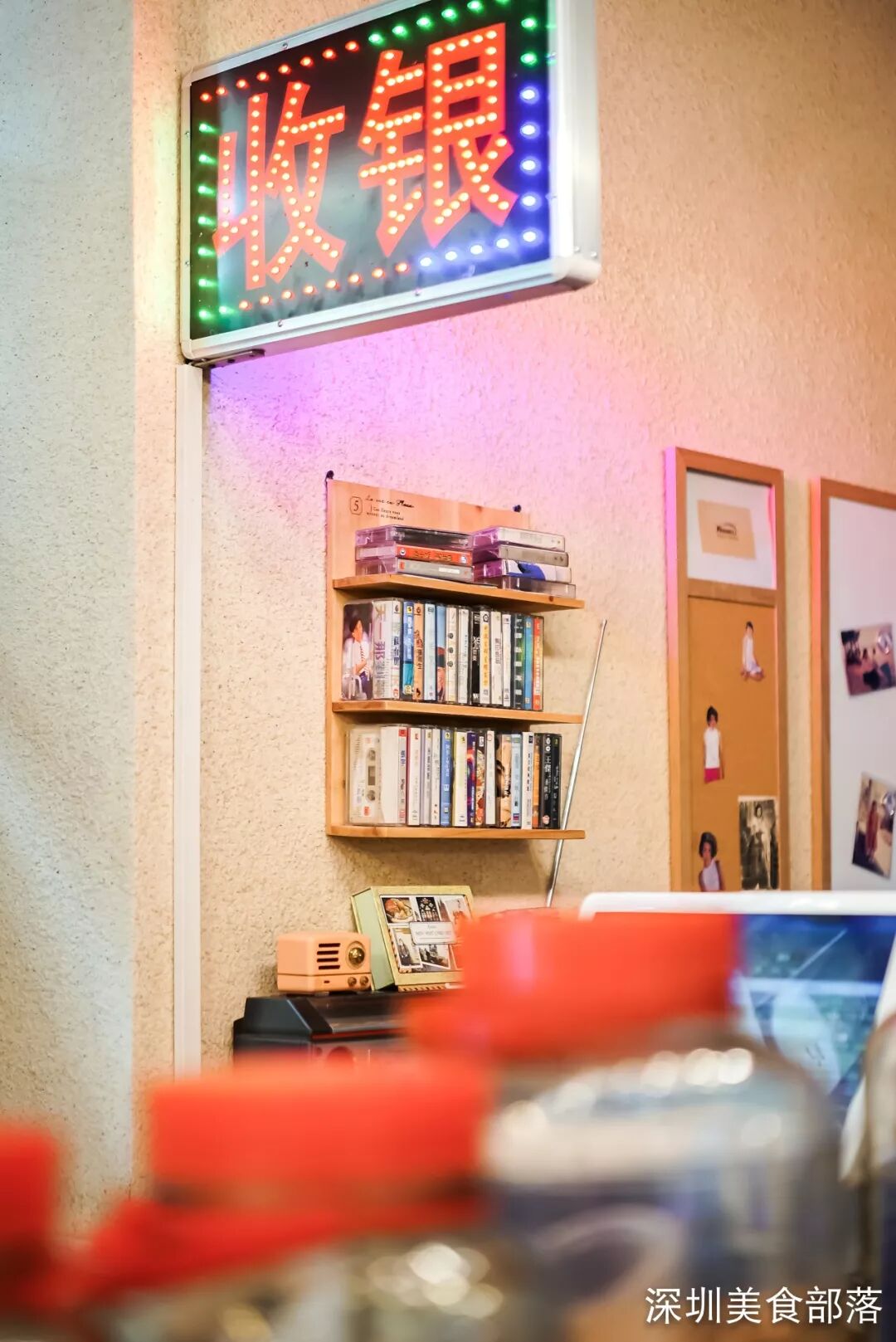 店面里装饰很别致,老式的复读机、绝版卡带以及张贴在门上各种复古的画报,一走进来,就有种回到过去的feel。对啦,还有个零食台,都是免费自取的。