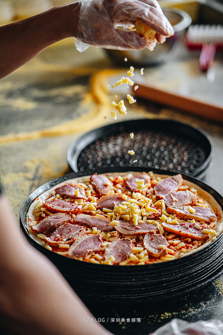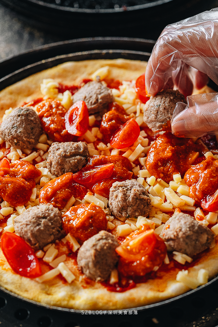 店里唯一手工厚底披萨,整整八颗肉多多牛肉丸,和3:7肥瘦比的猪腿肉酱,足料又够味。