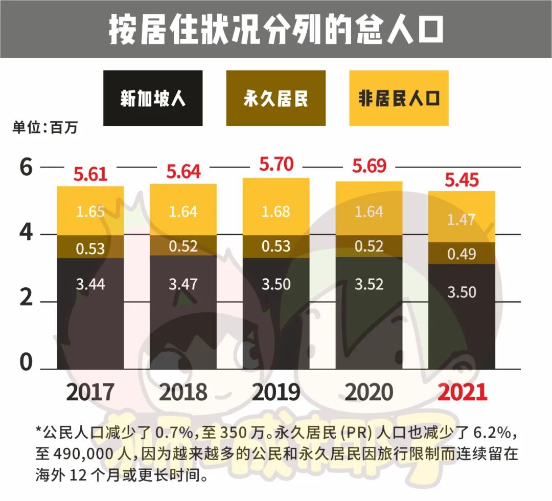 因为出入境的限制和各行业经济的复杂性,新加坡的非居民人口也进一步减少,这部分人口下降的比例相当高,足足下降了10.7%,跌至147万。