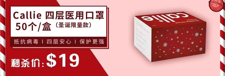 Callie是国际认证过的知名外科口罩供应商,最近推出了圣诞限量装口罩,绝对当得上小编心中氛围感口罩的No.1!他们家的口罩都是四层医用,上脸不闷,挂耳不勒,关键是颜值高,上脸有种高级感。是很多网红小姐姐小哥哥的出门必备款。