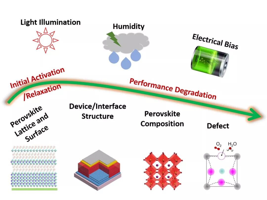 关于未来提升钙钛矿稳定性的重点方向,作者认为:由于缺陷和离子迁移是影响钙钛矿太阳能电池的关键因素,阐明器件在光、湿、热条件下的降解机理,确定缺陷演化路径、离子迁移的机理以及缺陷与离子迁移的相互作用等,需要继续深入发展表征技术和理论模型;基于对降解机制的深入理解,开发新型的晶格强化和表界面精准缺陷钝化方法及器件结构将对稳定性的提高起到关键作用。