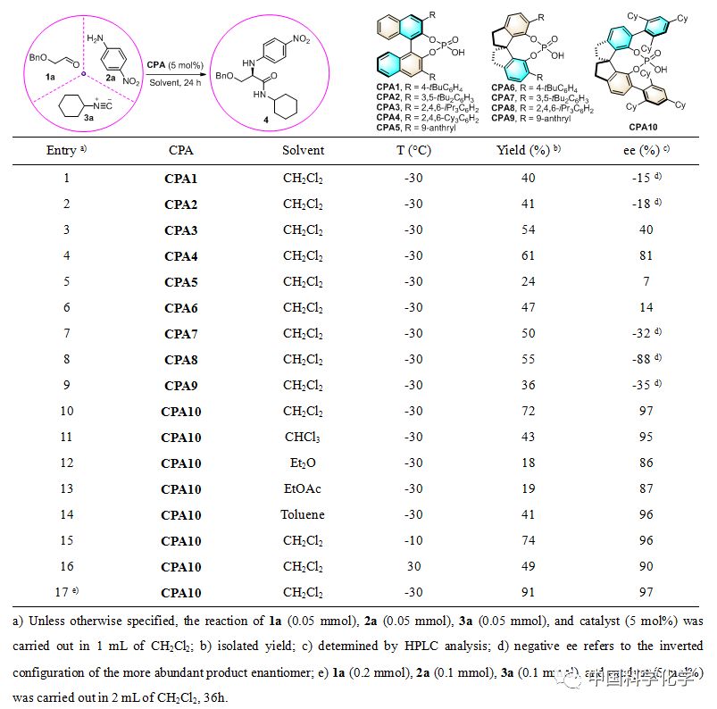 在这样的研究背景和设计思路下,作者筛选了一系列手性磷酸和条件,并确定了以下催化不对称三组分Ugi反应的最优条件:以SPINOL衍生的大位阻磷酸CPA10为催化剂,二氯甲烷为溶剂,-30 °C的条件下,可以较高的产率(91%)和对映选择性(97% ee)得到目标产物(图3)。