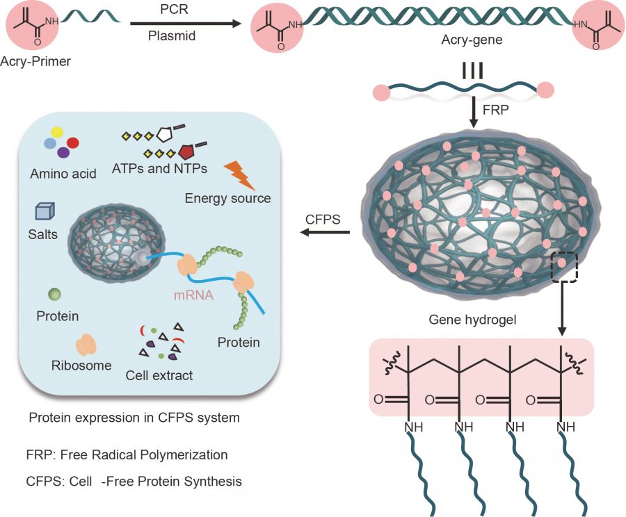 图1 基因水凝胶的合成以及在无细胞蛋白质合成(CFPS)体系中的蛋白质表达。