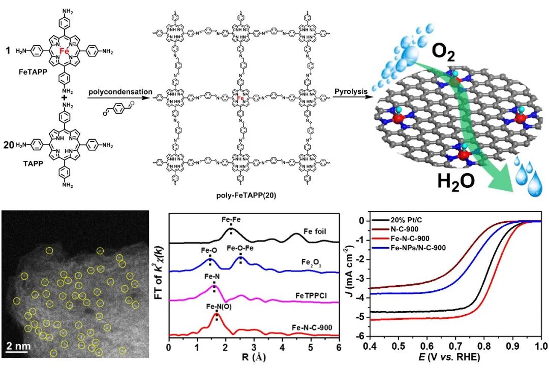 纪红兵教授等基于氨基卟啉聚合物构筑了铁单原子催化剂,并实现了碱性条件下高效电催化氧还原反应和活性位点识别。