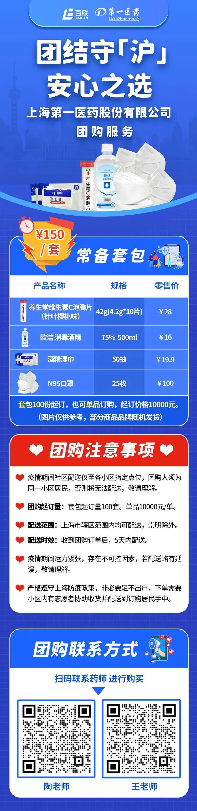 除了线上和线下渠道外,第一医药在运力、人力有限的情况下已开通以小区为单位的团购服务,内含维C泡腾片、消毒酒精、酒精湿巾、N95口罩等防疫物资,让我们一起团结守“沪”、安心之选。