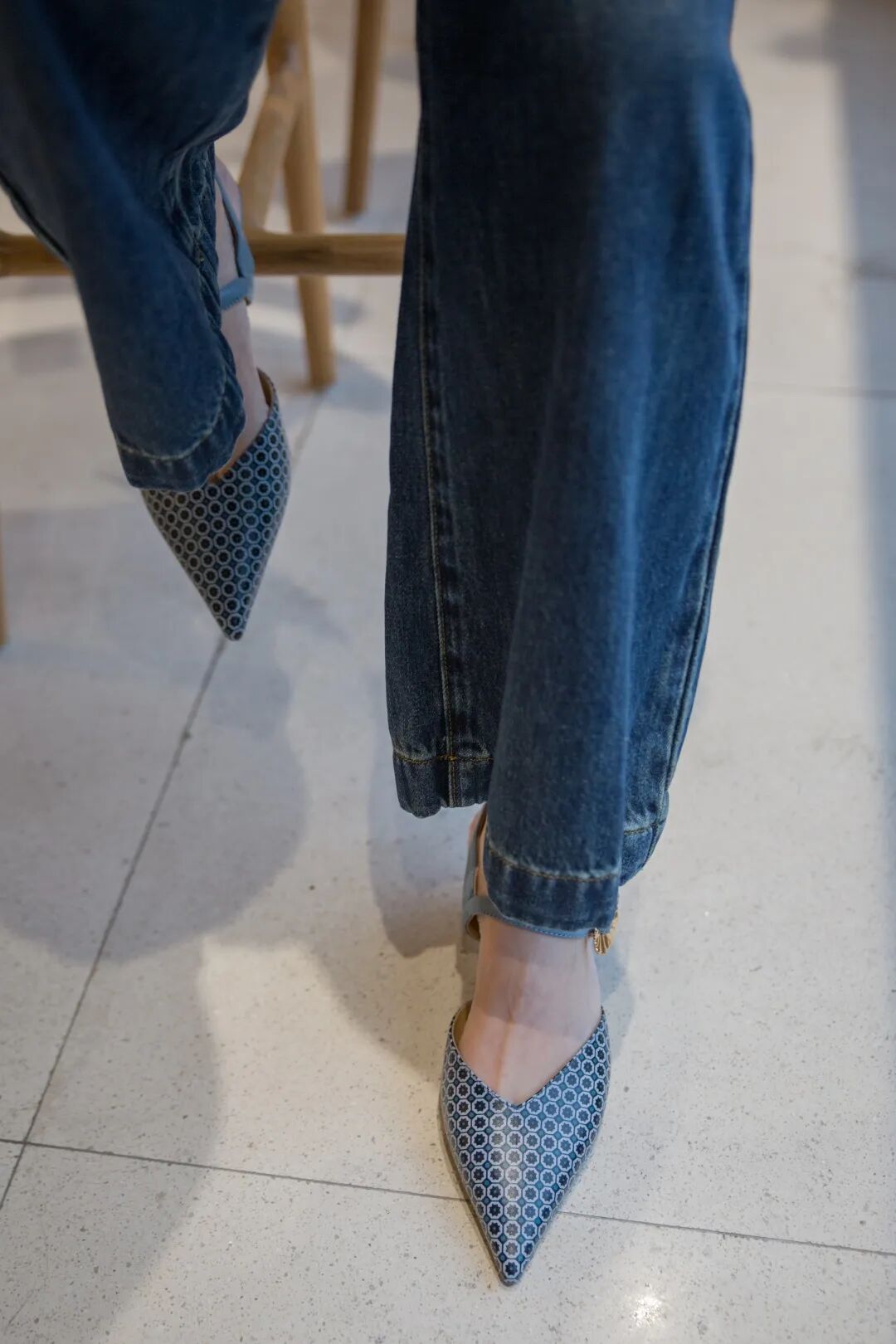 原本我还以为这双鞋会不会显得脚面比较宽,没想到它修饰脚型的效果也是一绝,瘦脚穿肯定是没问题的,宽脚也不显挤。我跟黄小姐的脚一窄一宽,但穿起来都舒服又好看。
