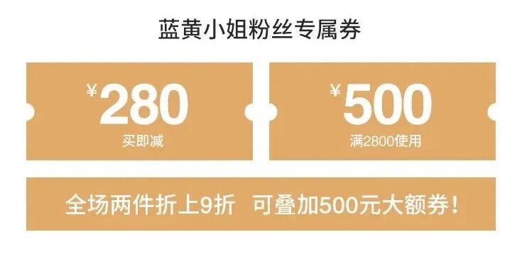 领取我们的专属优惠券,全场买即减280元,满2800减500元,而且全场两件以上折上再9折,还可以叠加500元的大额券用哦!