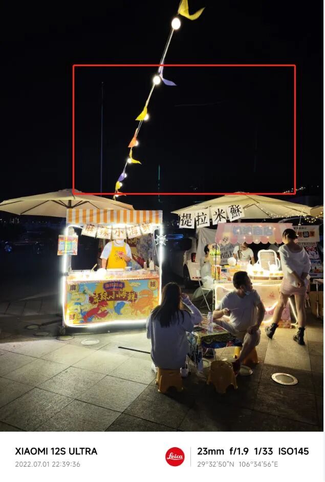 更大的感光尺寸带来的第一个红利,就是给小米12S Ultra带来了更强的暗光画质。进光量的大幅提升,让小米12S Ultra在夜间场景下不用借助当前主流的夜景算法也能获得足够优异的画质。以iPhone 13 Pro为参照,在这种偏极限的暗光场景下,iPhone自动触发了夜景模式,通过更长的曝光时间和多帧合成算法,提升了画面的亮度和细节表现。