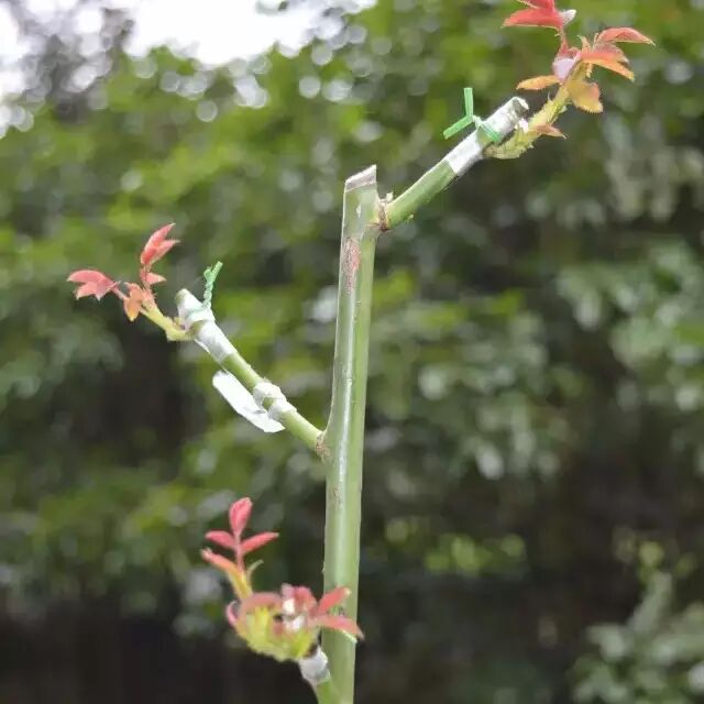 5. 一周之后再检查,如果叶柄枯黄,但芽点还是绿的,基本就成活了。一个月后你就能看到芽点萌发。下图是在树干顶端嫁接了4个芽,全部成活。