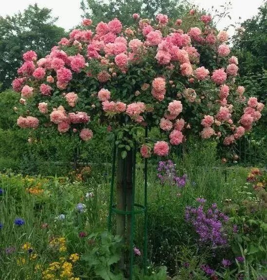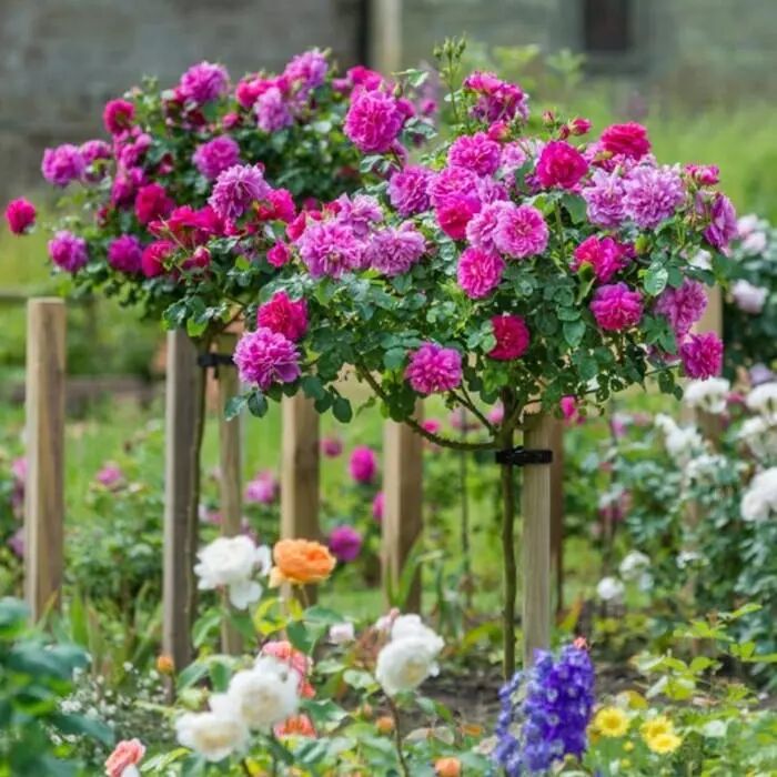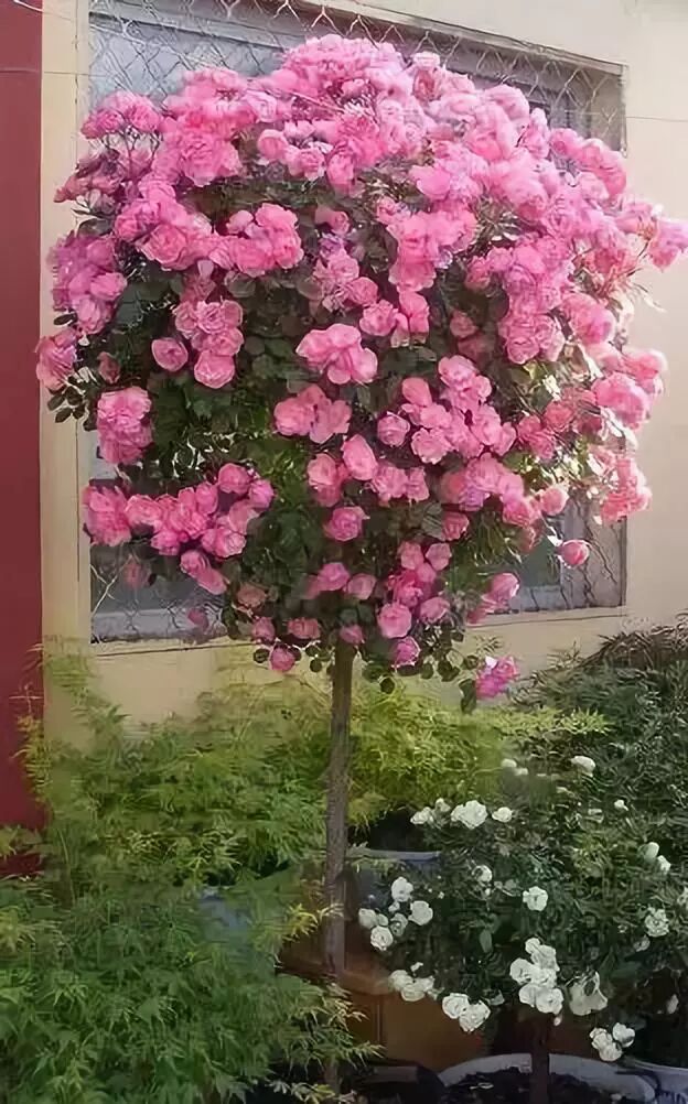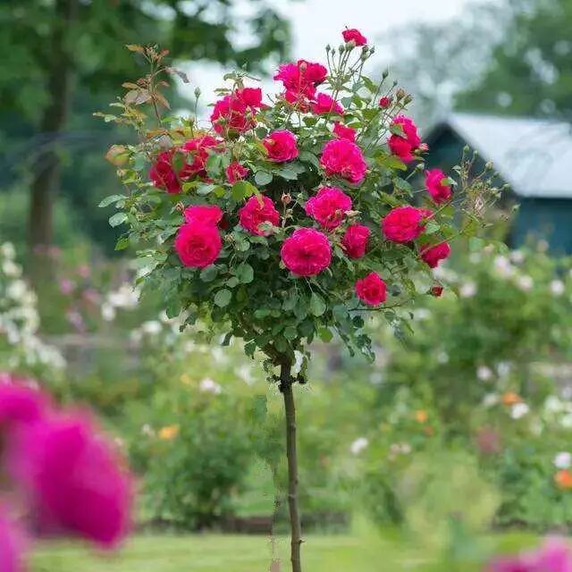 树状月季又称棒棒糖,就因为它头大尾小形似我们吃的棒棒糖。它是由一个直立树干通过园艺手段(扦插、养根、育干、嫁接、修剪、整形等措施)生产出来一种新型月季类型,用粗壮蔷薇作树干,从月季中优选直立性较好、树冠匀称的品种嫁接成枝的树木。