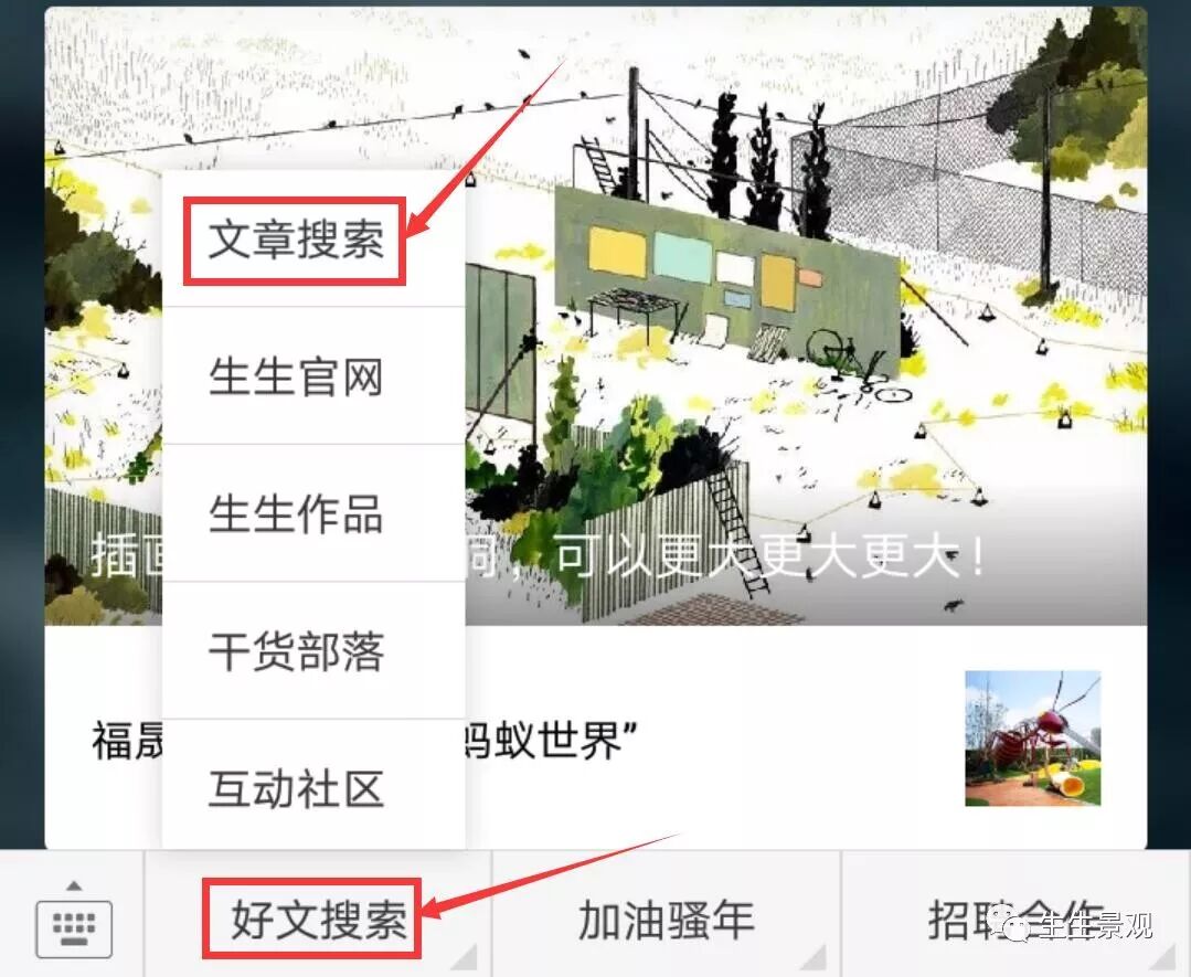进入生生景观微信后,在下方的菜单栏点击“好文搜索”——“文章搜索”