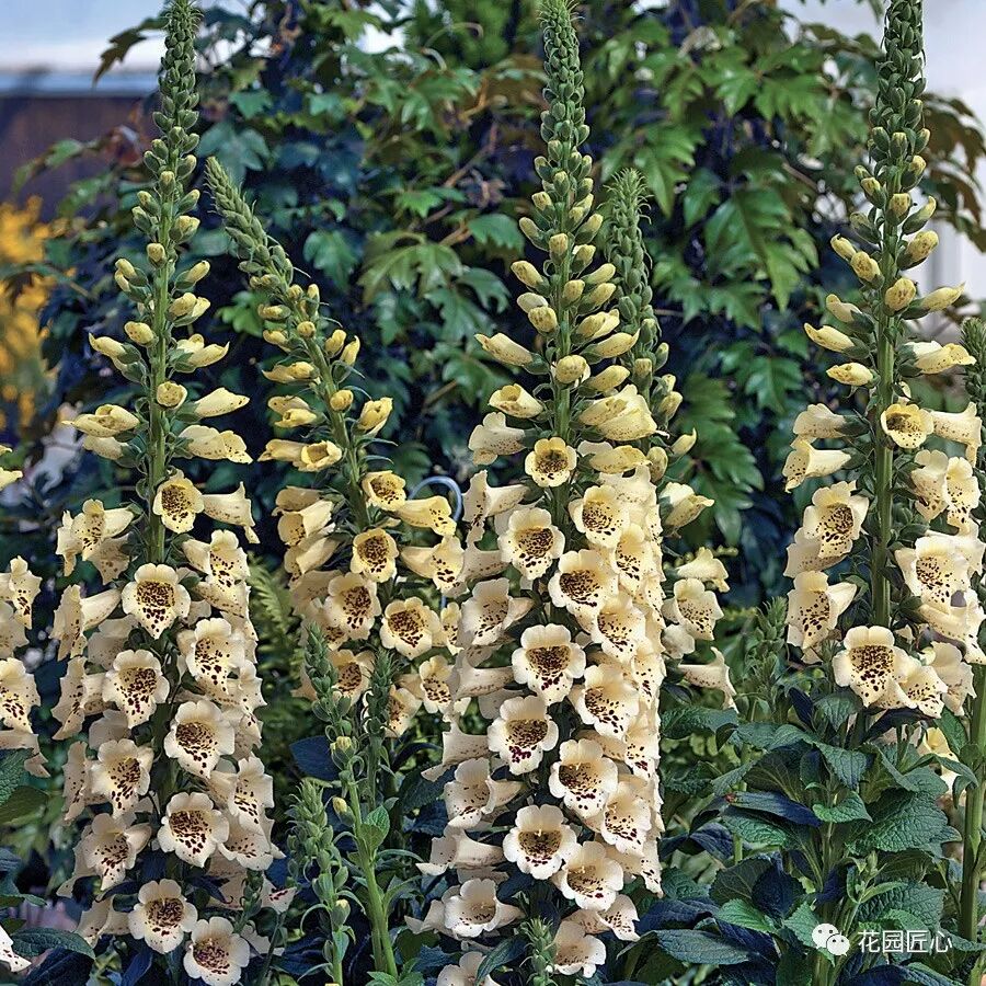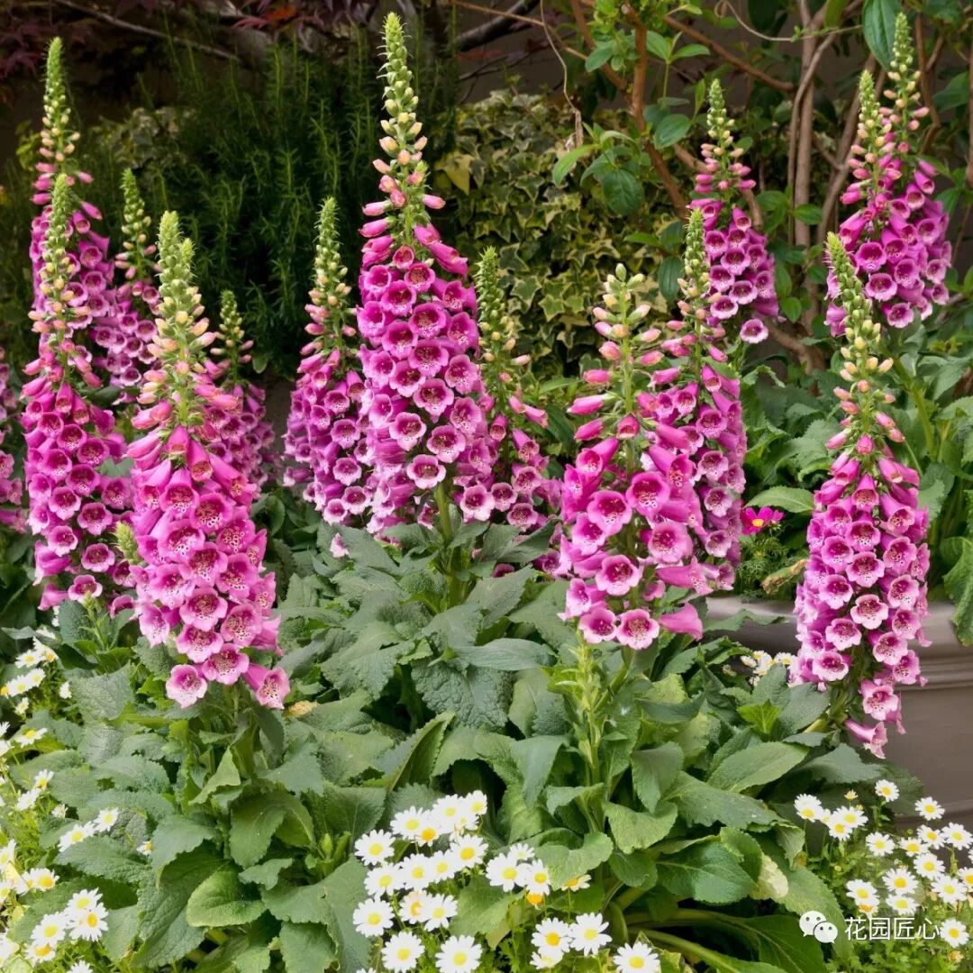 毛地黄株型直立挺拔,花朵繁密,栽在花园的花坛、花境和岩石园中,植于低矮的草本花卉与木本植物之间,高低错落,非常惹眼。