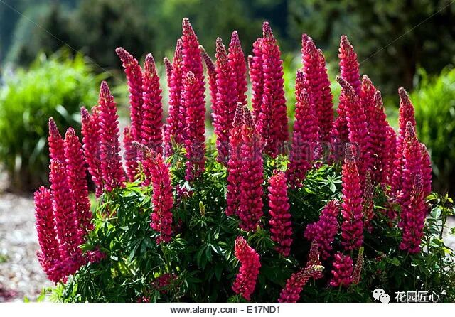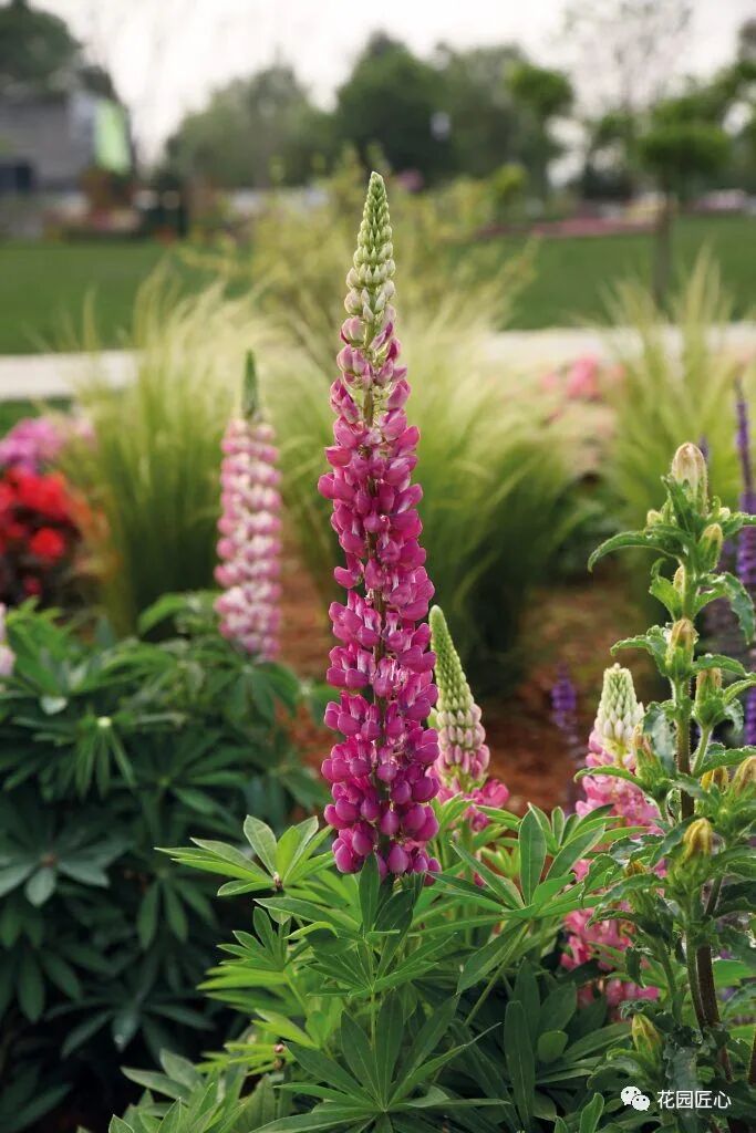 羽扇豆作为花境不可或缺的线条型花材之一,在色块、花镜的点缀中,因为其穗状花序丰满圆润,颜色鲜艳,具有很强的聚焦效应。