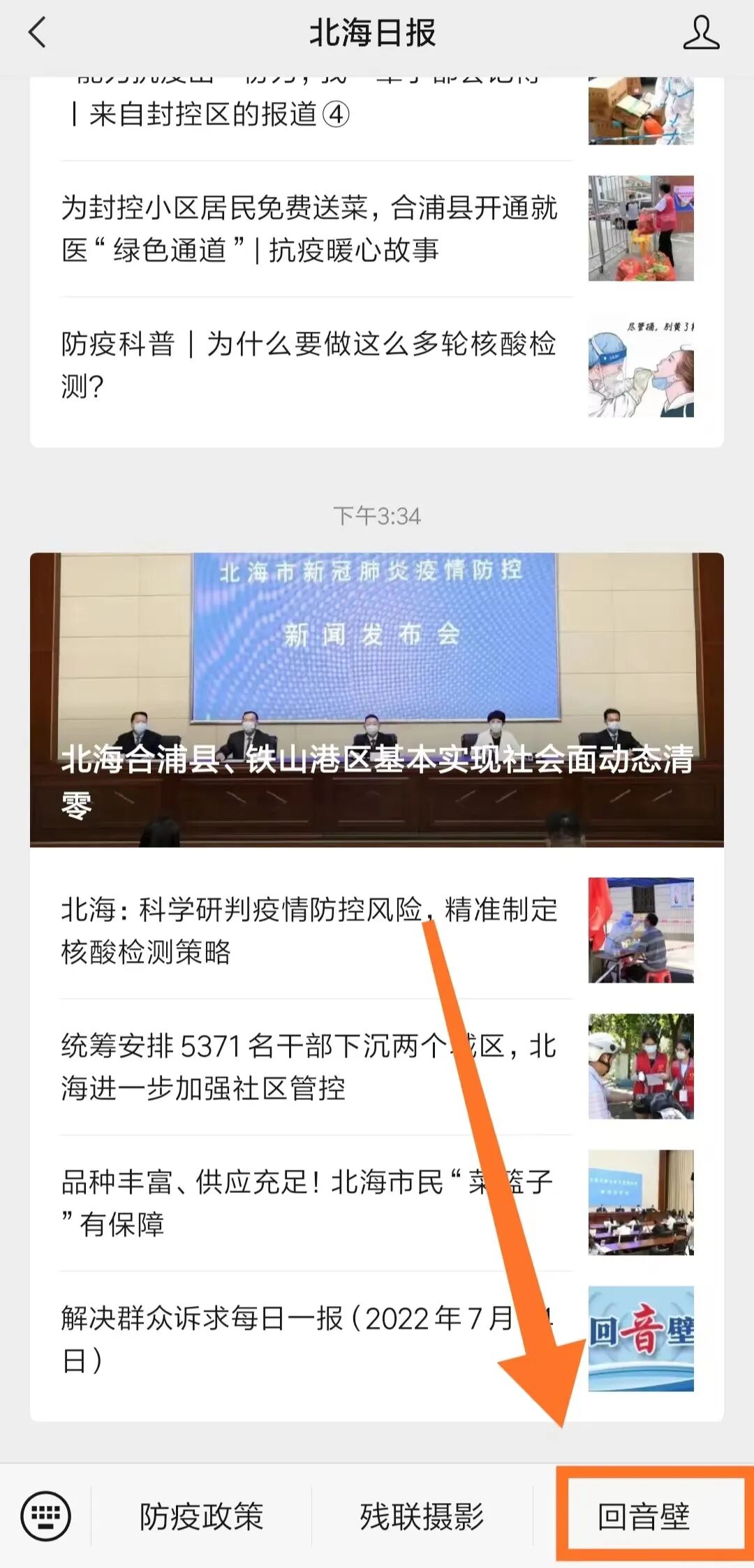 为了让广大市民及时了解到群众诉求办结情况和热点难点问题,继“防疫政策包”“暖心故事集”融媒平台上线后,自治区北海市疫情处置联合指挥部宣传组组织策划的“群众回音壁”平台也于今日上线。