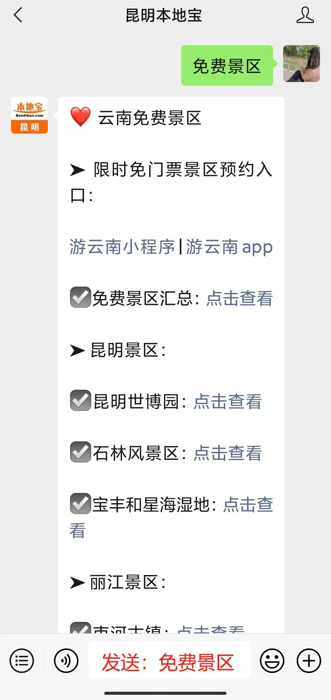 昆宝提醒:点击下方卡片,关注【昆明本地宝】微信公众号,在聊天对话框发送【免费景区】,即可获取昆明免费景区汇总。