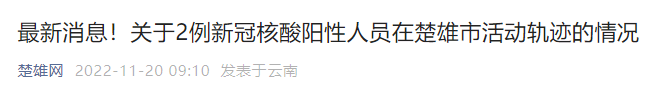 2022年11月19日,楚雄市疾病预防控制中心接到州外疾控中心协查函通知:2例新冠核酸阳性人员曾在楚雄市活动。我市迅速开展应急处置,及时对2人在楚雄市活动轨迹进行详细调查,涉及场所已进行消杀,相关密接人员已开展集中隔离,核酸检测结果均为阴性。为切实保障广大群众健康安全,现将活动轨迹和有关事项提示如下:
