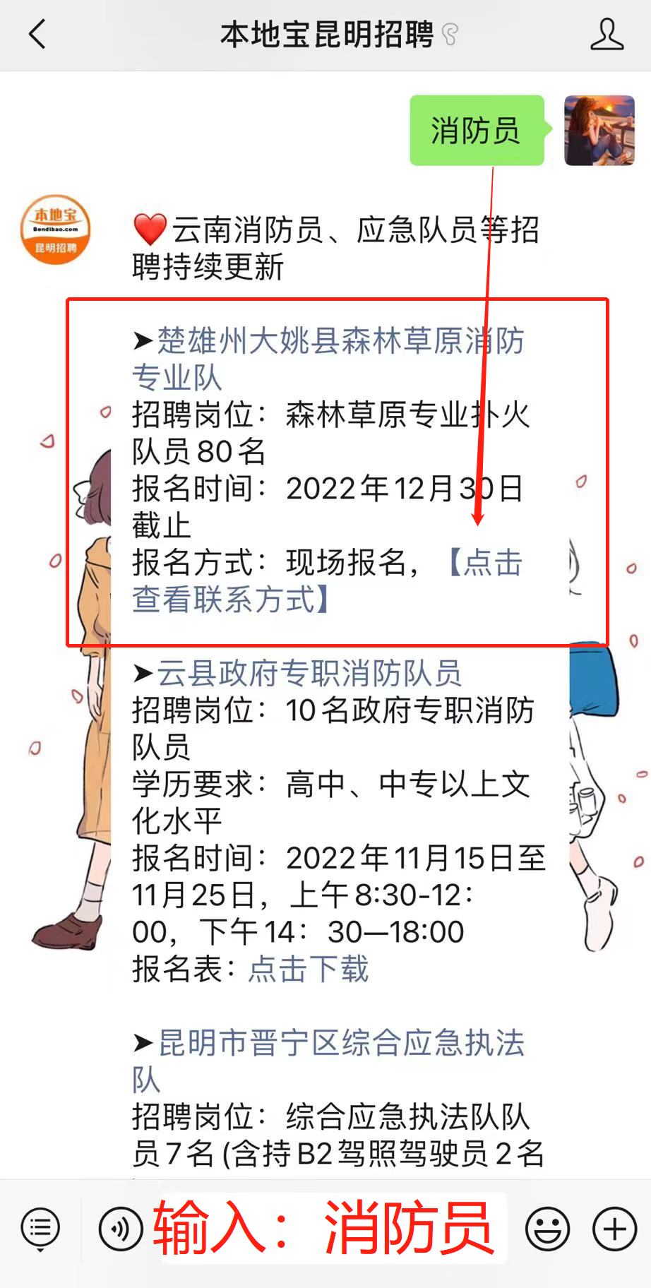 联系方式:关注【本地宝昆明招聘】在首页聊天对话框中回复【消防员】即可查看各报名地点的联系方式。