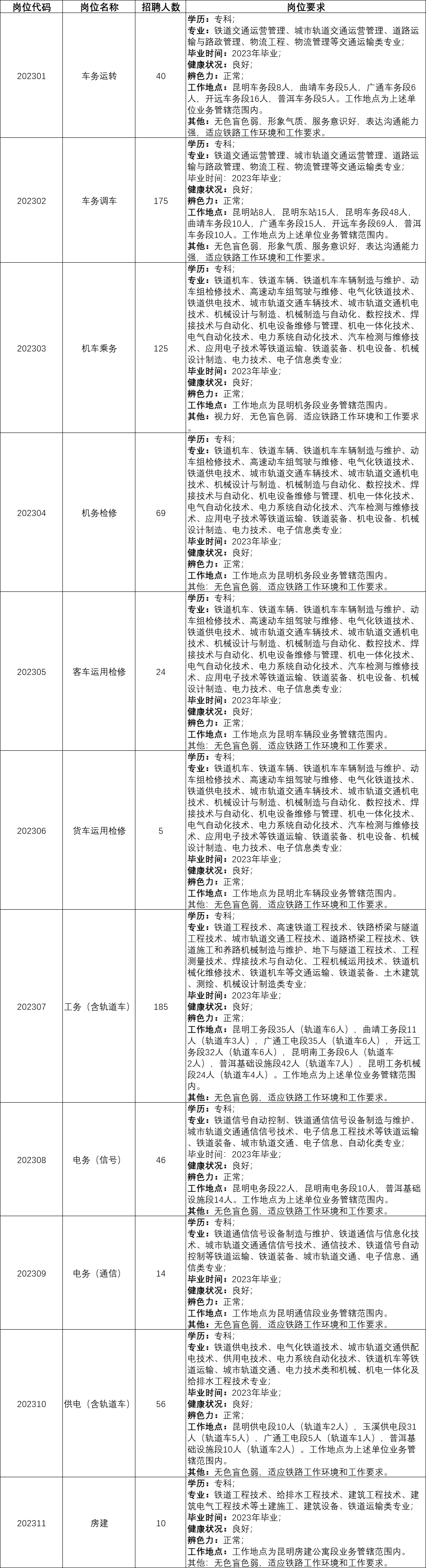 5.服从昆明局集团公司及所属用人单位对岗位、工作地点的安排和调整,能够适应铁路单位工作环境和岗位工作要求,新录用的铁路主专业及相近专业毕业生一般安排在运输站段生产一线操作技能岗位。